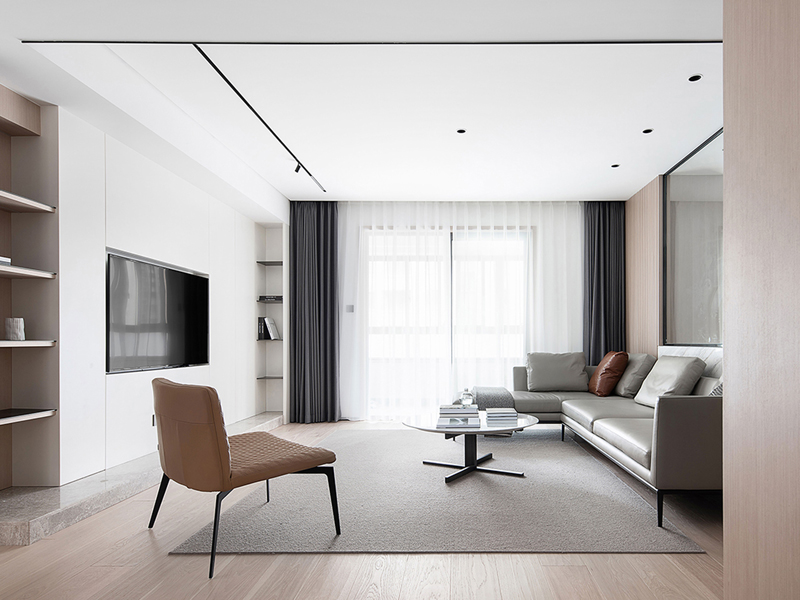 客厅没有过多的装饰,以纯净的白色与自然的木质相搭配,十分和谐不会有突兀的感觉。采用皮质沙发增添空间的层次感,让低调的空间融入了一份典雅。
