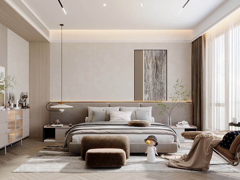 大户型的主卧室一般都很大,可以对空间进行合理规划布局,设计步入式衣帽间等等,既能让卧室空间的视觉面积避免过于突兀,也能彰显睡眠区的惬意氛围。另外,卧室作为家中主要的休憩空间,要做好隔音和遮光设计。