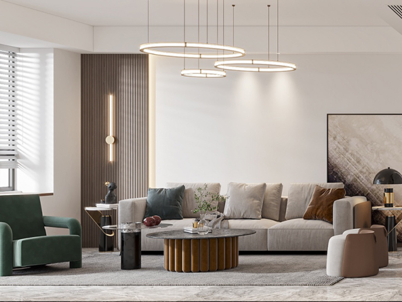 背景墙采用格栅木饰面进行装饰,提升空间层次感,让空间更立体,舒适的布艺沙发让整体更柔和惬意。
