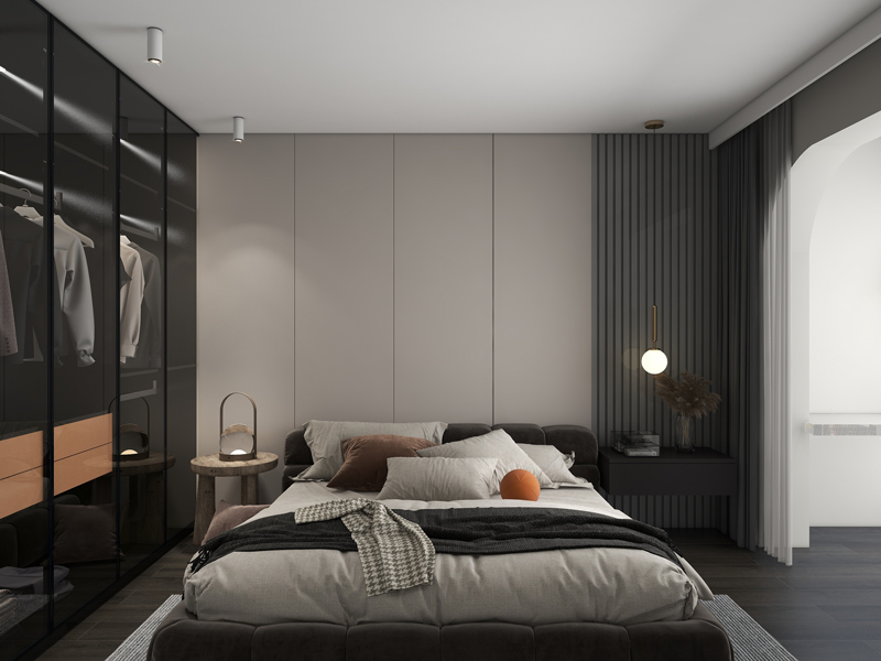 卧室色调搭配较深,更符合睡眠需求,采用格栅装饰的背景墙增添空间层次更丰富,整体时尚自然。